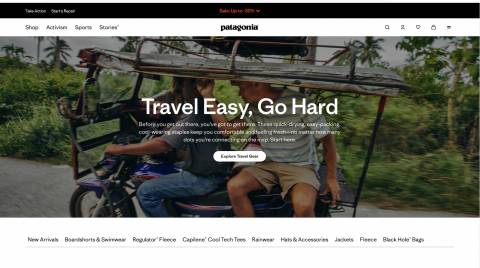 De website van Patagonia voelt als een manifest. Het merk gebruikt het platform niet alleen om te verkopen, maar om hun boodschap over duurzaamheid en natuurbehoud krachtig te verspreiden.