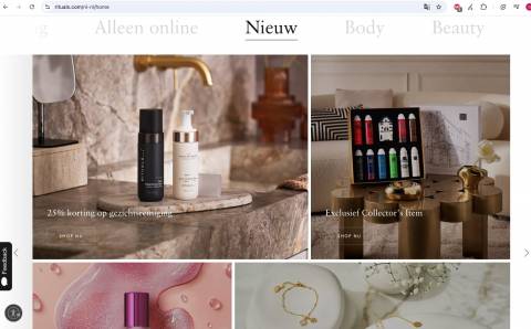 De Rituals-website ademt rust, luxe en verzorging. Met warme kleuren, vloeiende overgangen en elegante beelden voelt het alsof je door een digitale spa navigeert.