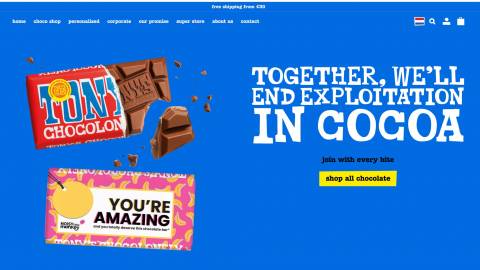 De website van Tony’s Chocolonely is speels, opvallend en tegelijk inhoudelijk geladen. Het gebruik van felle kleuren, illustraties en ongebruikelijke layout weerspiegelt hun rebelse karakter.